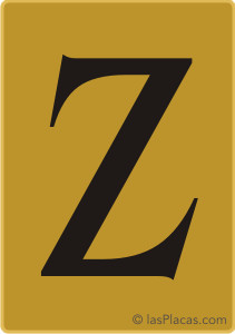 Placa para viviendas letra 'Z', está GRABADA en aluminio de 1 mm., recanteada, se puede suministrar en DORADO o PLATEADO al mismo precio. Hay 8 tamaños fijos para elegir. Se enviá adhesiva.