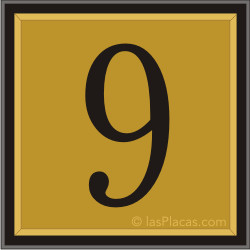 Placa para viviendas número '9', está GRABADA en LATON satinado biselado con base negra. Hay 8 tamaños fijos para elegir. Se envia adhesiva.