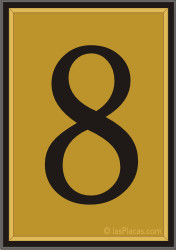 Placa para viviendas número '8', está GRABADA en LATON satinado biselado con base negra. Hay 8 tamaños fijos para elegir. Se envia adhesiva.