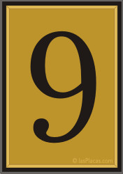 Placa para viviendas número '9', está GRABADA en LATON satinado biselado con base negra. Hay 8 tamaños fijos para elegir. Se envia adhesiva.