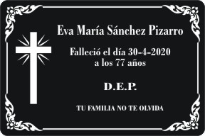 Placa para difuntos en aluminio de excelente calidad y duración, cantos redondeados. Dispone de 400 caracteres para PERSONALIZAR su placa. Puede figurar uno o varios difuntos con fechas y la dedicatoria que desee, con 11 tamaños para elegir